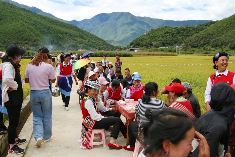 傍晚時(shí)分,炊煙氤氳,啟別村的百家宴上,稻田鴨、稻田魚、土雞肉、臘豬腳、大米飯……香氣四溢,金燦燦的稻田邊,桌與桌相接,心與心相連,大家在田野里感受著別樣豐收。