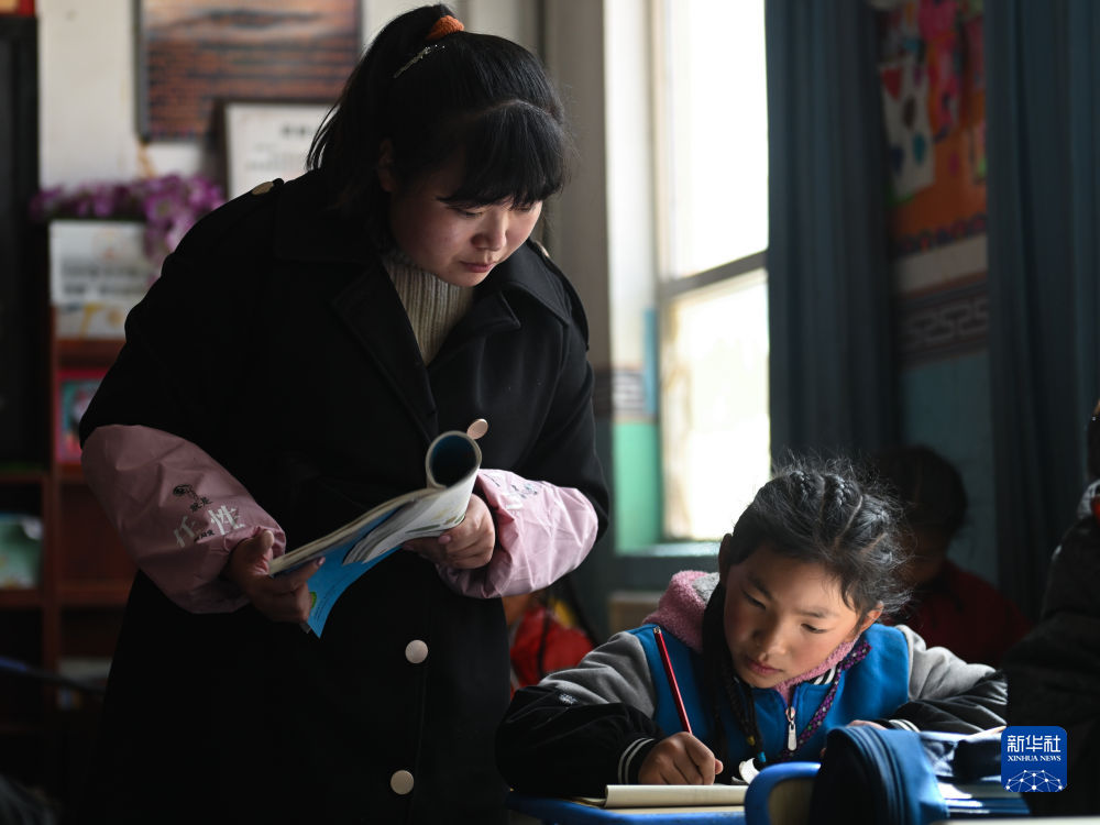 在曲麻萊縣秋智鄉(xiāng)幼兒園,教師索南(左一)在課堂上和義西卓瑪(右二)玩游戲(9月13日攝)。新華社 張宏祥 攝