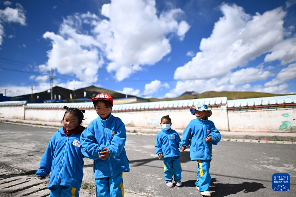 在曲麻萊縣秋智鄉(xiāng),仁青卓瑪(左二)和伙伴們一起進入幼兒園(9月13日攝)。新華社 張宏祥 攝