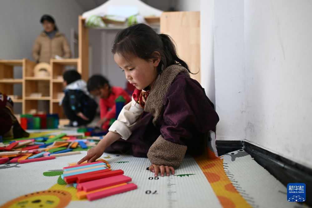 在曲麻萊縣麻多鄉(xiāng)幼兒園,索南拉吉(右一)在教室內(nèi)搭積木(9月20日攝)。新華社 張宏祥 攝