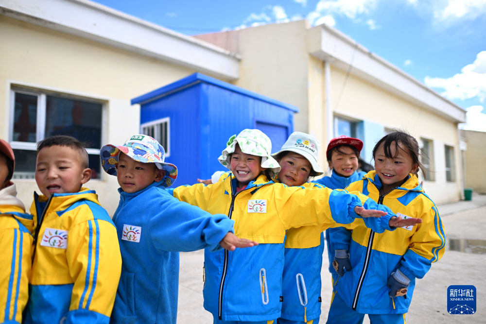 在青海省玉樹藏族自治州曲麻萊縣秋智鄉(xiāng)布甫村陽光幼兒園,孩子們走出教室準(zhǔn)備開始戶外活動(9月14日攝)。新華社記者 張宏祥 攝