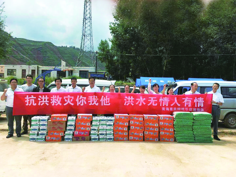中壩藏族鄉(xiāng)遭遇洪災后,黃得梅(左七)組織樂都區(qū)放映隊前往災區(qū)送物資、放電影。