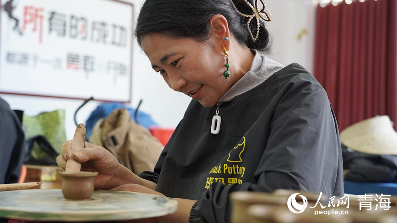 “在這兒既能在老師的指導(dǎo)下免費(fèi)學(xué)到黑陶制作技藝,還能帶孩子?!鼻嗪J」宀刈遄灾沃莅喱斂h瑪可河鄉(xiāng)牧民金措正在打磨一件黑陶器皿,姑娘就坐在旁邊,時(shí)而玩泥巴,時(shí)而喝牛奶,一雙大眼睛好奇地觀察著四周。