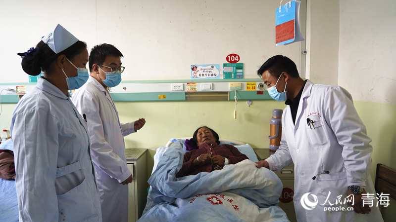班瑪縣人民醫(yī)院醫(yī)護(hù)人員查看患者病情。人民網(wǎng) 楊啟紅 攝