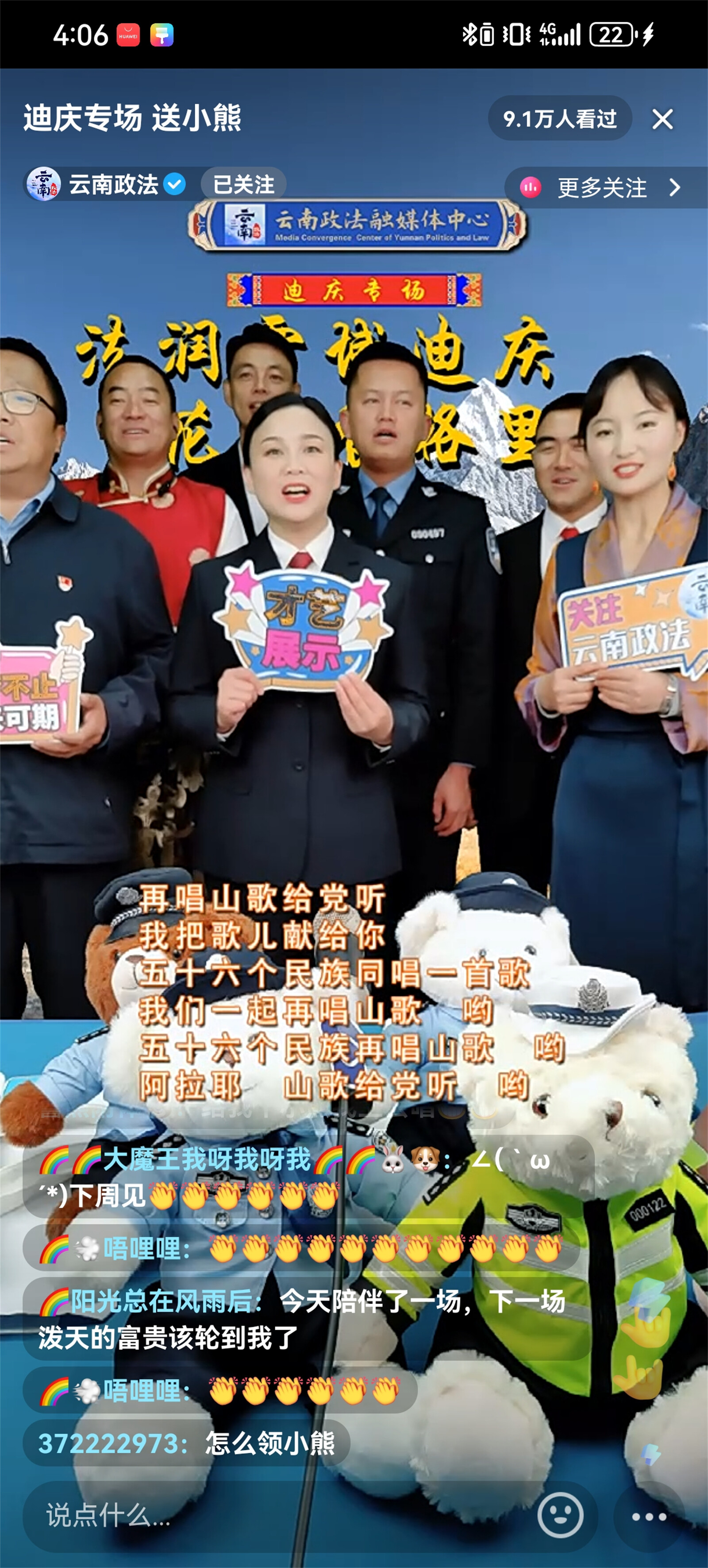 近日,迪慶州政法干警走進(jìn)云南政法普法強(qiáng)基直播間開(kāi)展“法潤(rùn)雪域迪慶、花開(kāi)香格里拉”迪慶州普法專場(chǎng)直播,直播聚焦群眾關(guān)切,緊密聯(lián)系時(shí)事熱點(diǎn),帶廣大網(wǎng)友體驗(yàn)了一場(chǎng)內(nèi)容豐富的普法之旅,共吸引9.1萬(wàn)人觀看,獲點(diǎn)贊超10.4萬(wàn)。