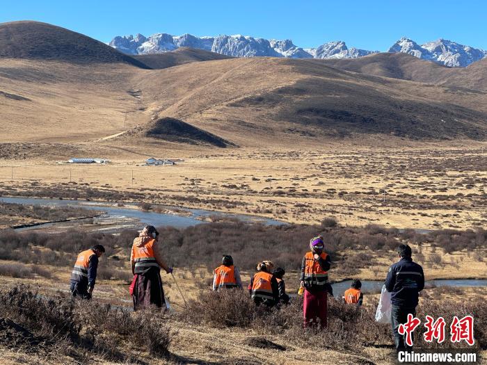 圖為斗格加(右一)和管護員們正在撿拾垃圾。劉洋 攝