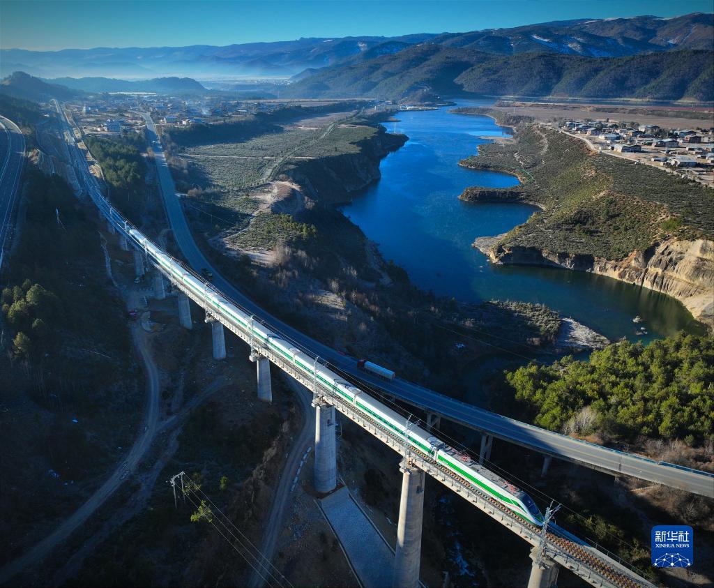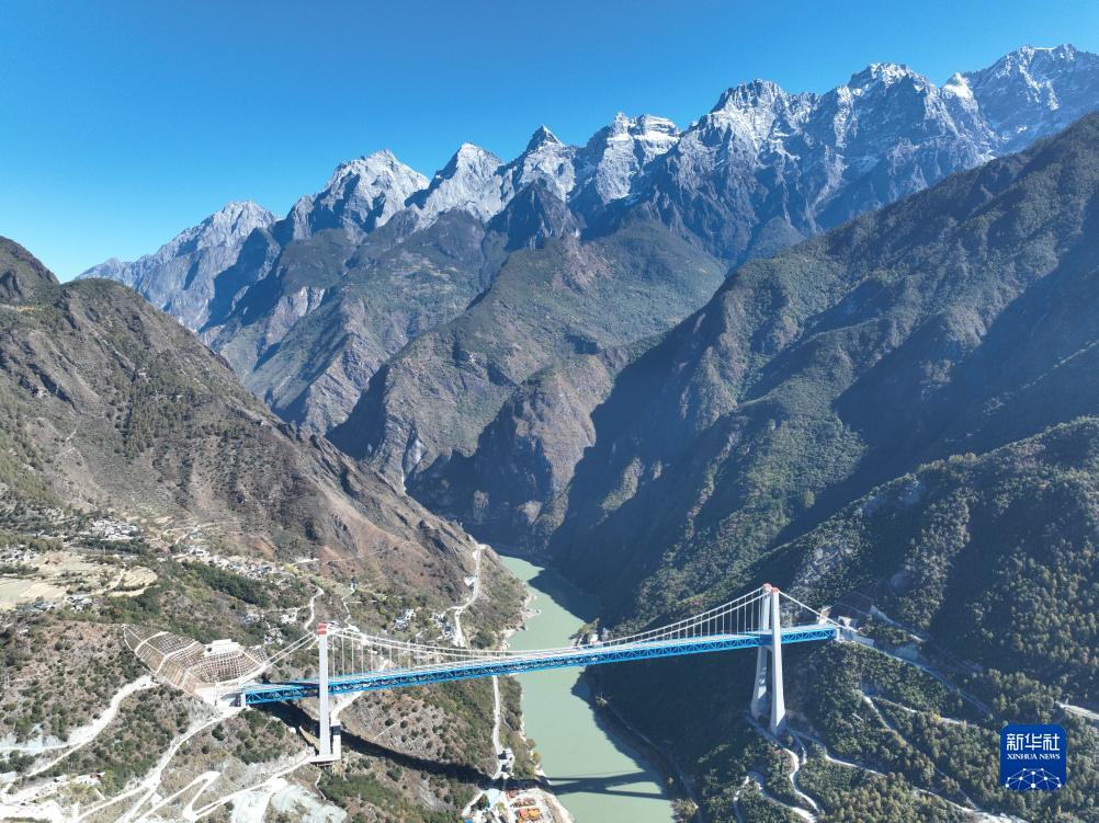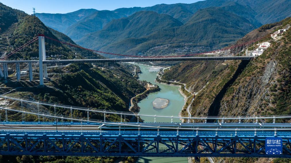 11月26日,列車駛過虎跳峽金沙江鐵路大橋(無人機照片)。新華社記者 邢廣利 攝