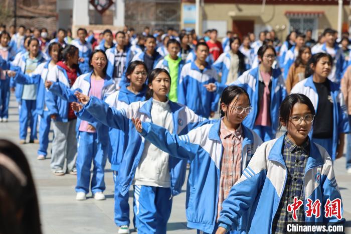 一陣急促的鈴聲響起,課間操時(shí)間到了。藍(lán)天白云下,學(xué)生們?cè)诓賵?chǎng)上跳起藏族特色的鍋莊舞。操場(chǎng)邊,35歲的藏文老師洛登也跟著音樂(lè)跳了起來(lái)。