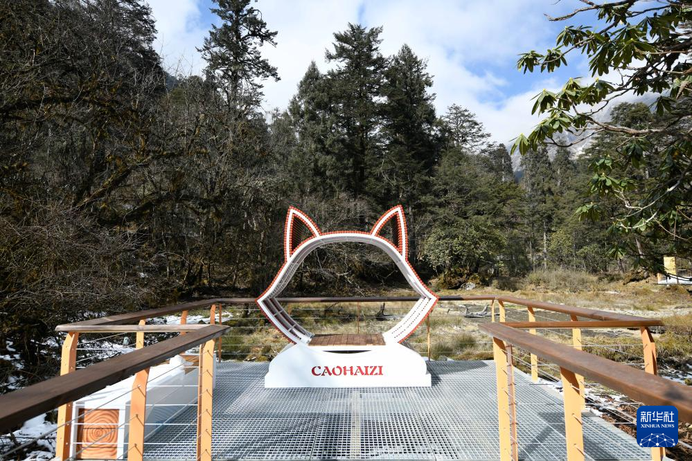 這是1月10日拍攝的海螺溝景區(qū)草海子步游道上一處裝置。景區(qū)重建時(shí)在步游道上新增了動(dòng)物造型裝置,供游客拍照打卡。新華社記者 胥冰潔 攝