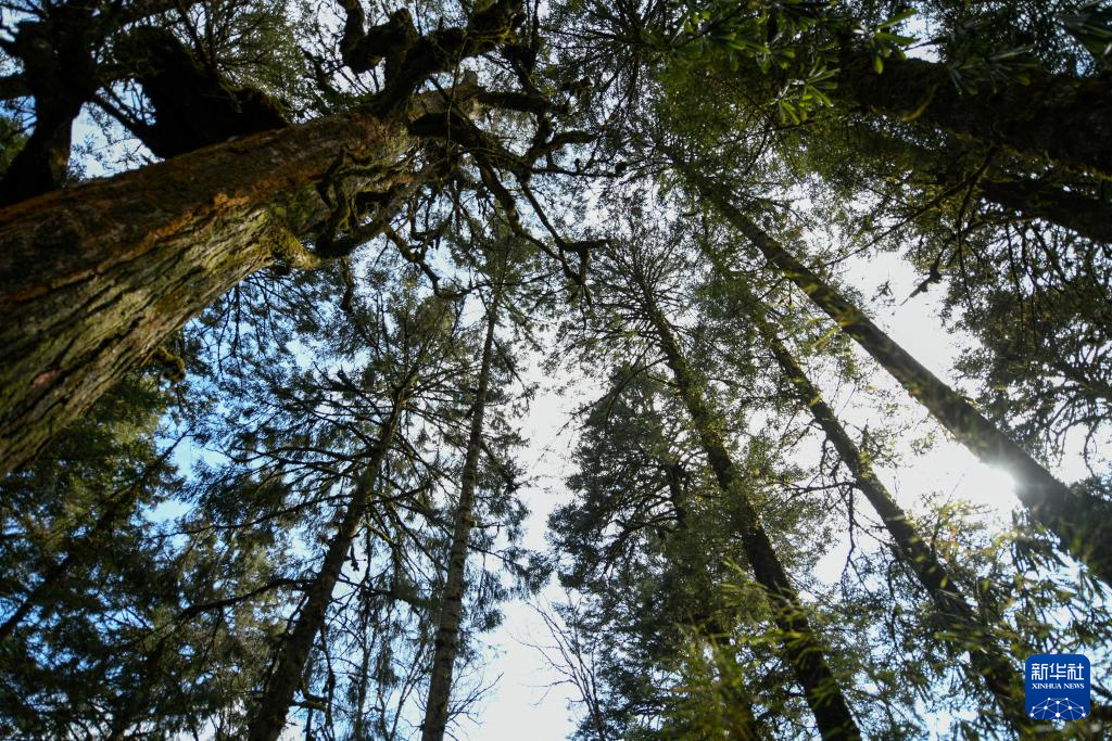 這是1月10日在海螺溝景區(qū)草海子步游道上拍攝的杉樹。新華社記者 胥冰潔 攝