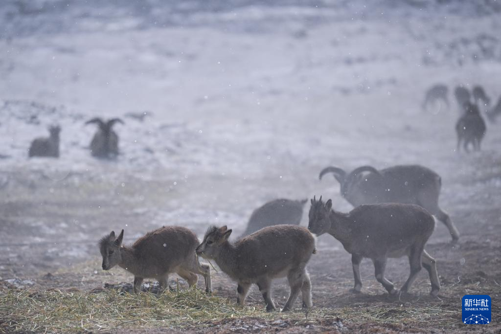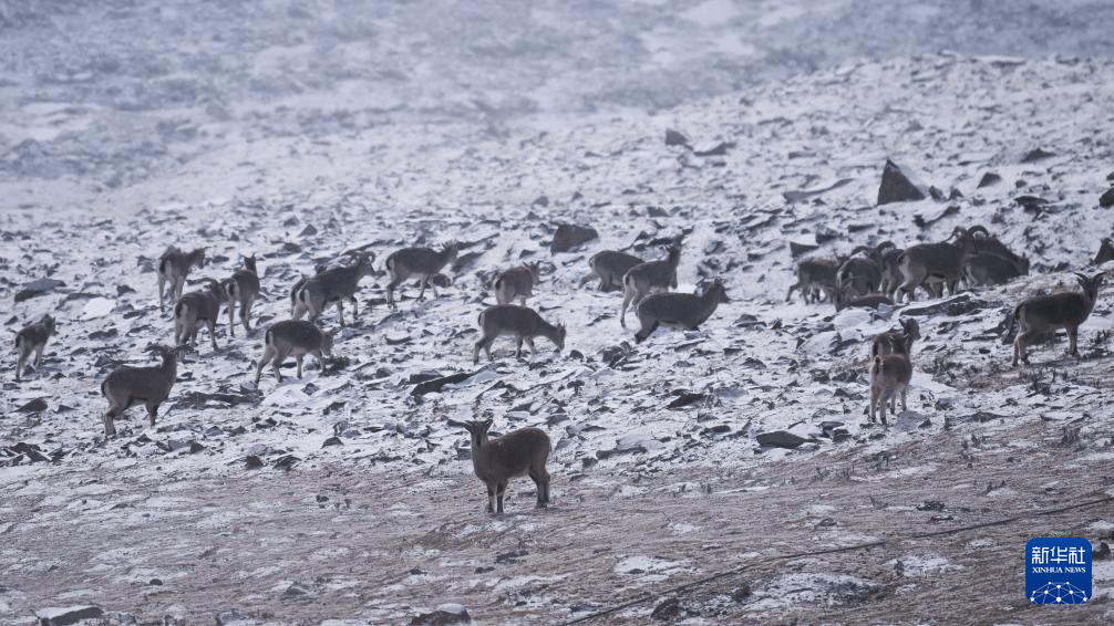 1月23日,幾只巖羊在青海省海北藏族自治州門源回族自治縣境內(nèi)的崗什卡雪峰活動。新華社記者 張龍 攝