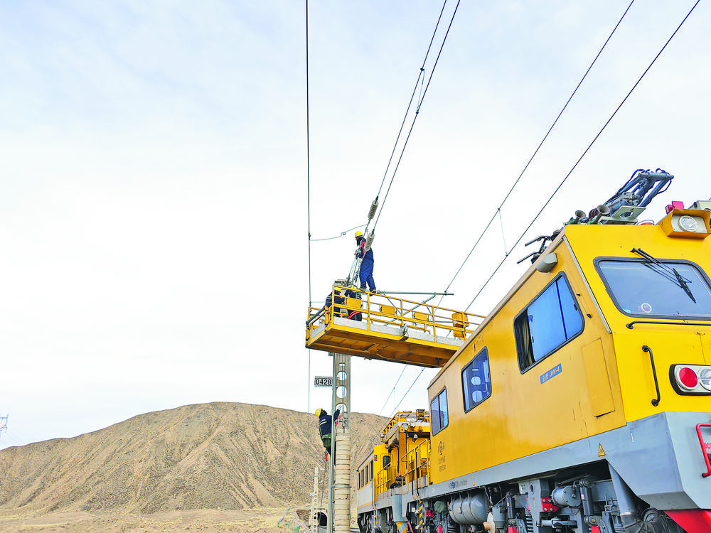 職工利用接觸網(wǎng)作業(yè)車平臺進(jìn)行故障消缺。西寧供電段供圖