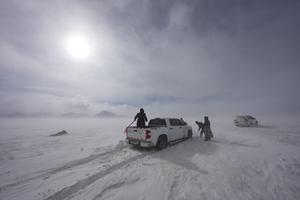 瑪曲鄉(xiāng)長江源黨員環(huán)保志愿隊(duì)巡邏途中車輛陷入雪中后進(jìn)行自救(2024年2月2日攝)。新華社記者 晉美多吉 攝