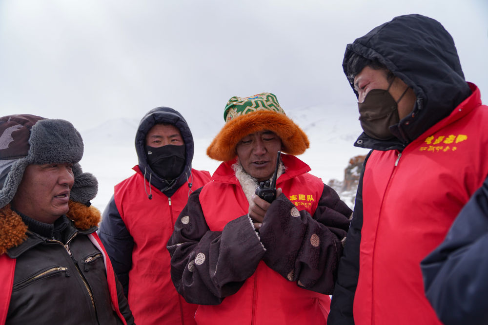 瑪曲鄉(xiāng)長江源黨員環(huán)保志愿隊(duì)隊(duì)員在巡邏時(shí)通過對講機(jī)互相聯(lián)系(2024年2月2日攝)。新華社記者 晉美多吉 攝