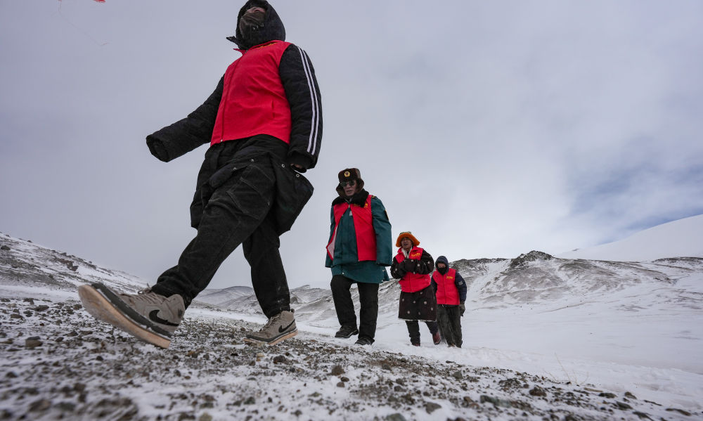 瑪曲鄉(xiāng)長江源黨員環(huán)保志愿隊(duì)年近七旬的才嘎老人(左二)在巡邏守護(hù)長江源(2024年2月2日攝)。新華社記者 晉美多吉 攝