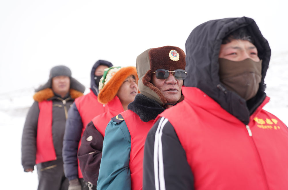 瑪曲鄉(xiāng)長江源黨員環(huán)保志愿隊(duì)年近七旬的才嘎老人(右二)在巡邏守護(hù)長江源(2024年2月2日攝)。新華社記者 晉美多吉 攝