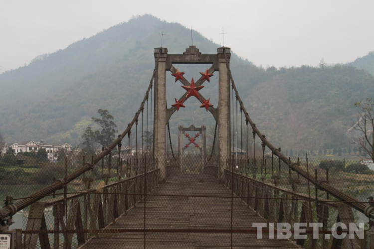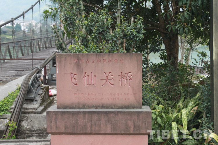 站在橋邊,遙望蜿蜒的江水就是青衣江,飛仙關(guān)橋全長164米,寬4.5米,索塔為鋼筋混凝土門式框架,高29米,流動(dòng)式索鞍,策略式索錠,當(dāng)時(shí)的設(shè)計(jì)載重為15噸。橋柱橫額上有時(shí)任西南軍政委員會(huì)主席劉伯承所題寫的橋名——“飛仙關(guān)橋”。橋西岸塔柱有時(shí)任十八軍政委譚冠三題寫的檻聯(lián)——“發(fā)揮天才,發(fā)揮力量,戰(zhàn)勝困難,創(chuàng)造人民幸福,一面進(jìn)軍,一面建設(shè)解放西藏,鞏固西南國防”的字樣。東岸塔柱上有時(shí)任西康省主席廖志高題寫的檻聯(lián)——“勞動(dòng)創(chuàng)造世界飛仙天險(xiǎn)何難克服,革命帶來幸福閉塞邊區(qū)從此繁榮”字樣。橋上五顆閃閃的紅星,映照著飛仙關(guān)的繁榮,也印證著革命前輩們的美好愿景已經(jīng)變?yōu)楝F(xiàn)實(shí)。