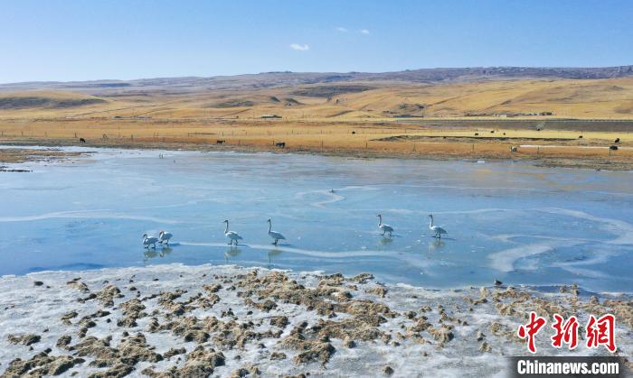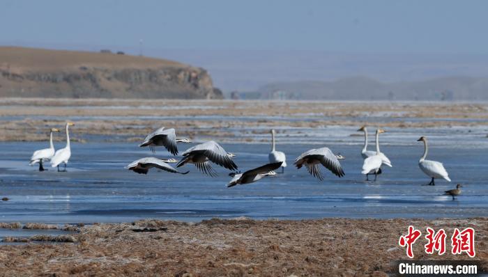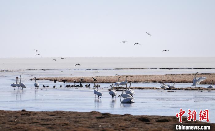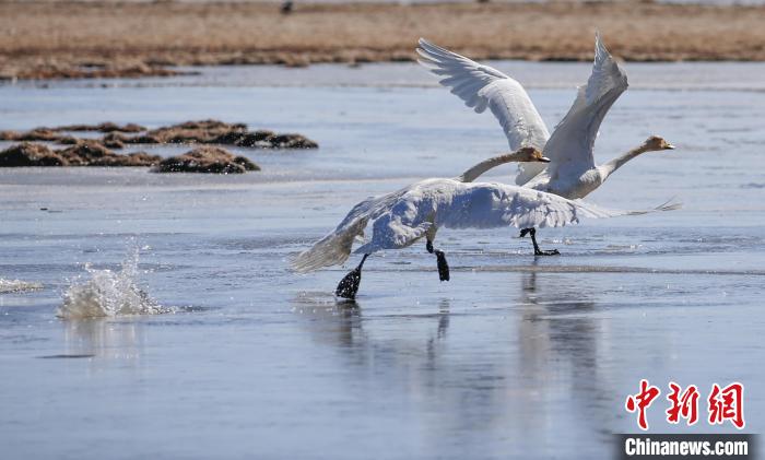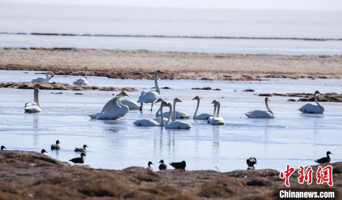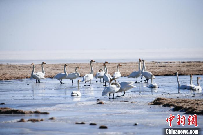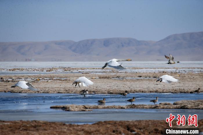 3月13日,青海省海南藏族自治州共和縣境內(nèi)的青海湖泉灣濕地,大天鵝沐浴春日暖陽。隨著天氣轉(zhuǎn)暖,大天鵝、斑頭雁、赤麻鴨等水鳥聚集在青海湖泉灣濕地,時而振翅飛翔、時而戲水覓食,鳴叫聲不絕,為仍處于冰封的青海湖增添生機和活力。