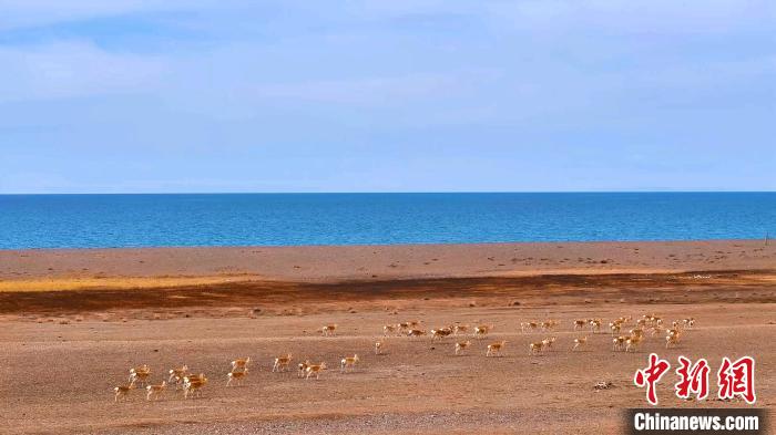 圖為大群普氏原羚在青海湖畔游走。桑吉才讓 攝