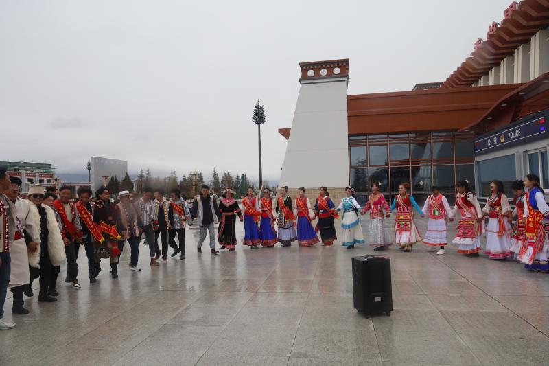 5月5日下午2點半,陰雨中的麗香鐵路香格里拉站,一曲曲歡快的傈僳族打跳,引來眾多游客和乘客駐足觀看,大家紛紛拍照合影,有的還加入學跳。