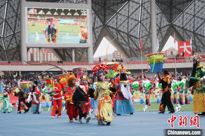 圖為開幕式現(xiàn)場社火高蹺進行表演。馬銘言 攝