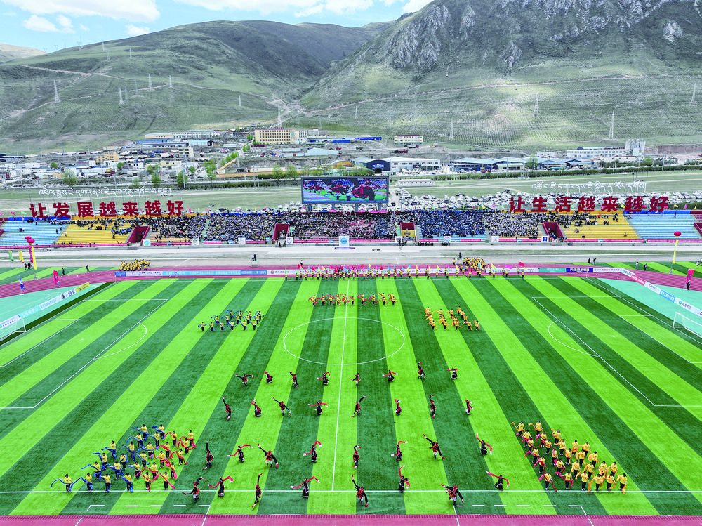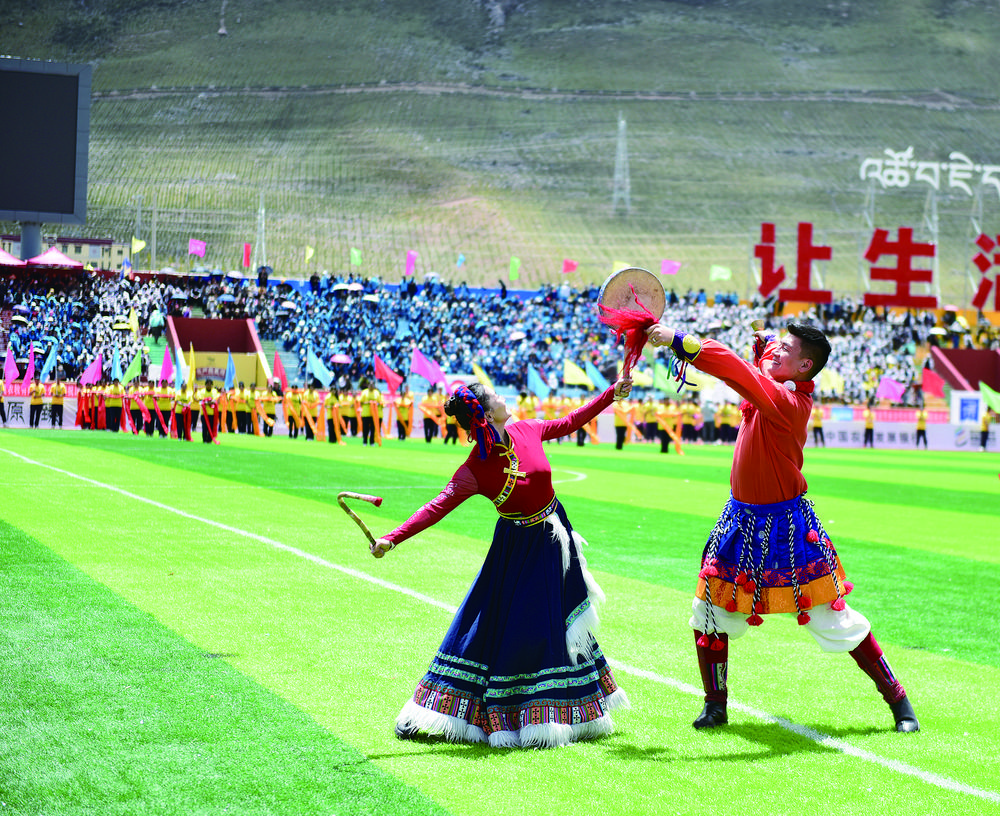 13時30分,一曲精彩的《熱巴舞》拉開開幕式序幕,現(xiàn)場觀眾熱情似火,掌聲不斷?!帮w躍的玉樹足球,有我揮灑的青春……”隨著本土歌手嘎瑪西周創(chuàng)作的歌曲《點(diǎn)燃夢想》唱響,玉樹牦牛隊主場氛圍“拉滿”。