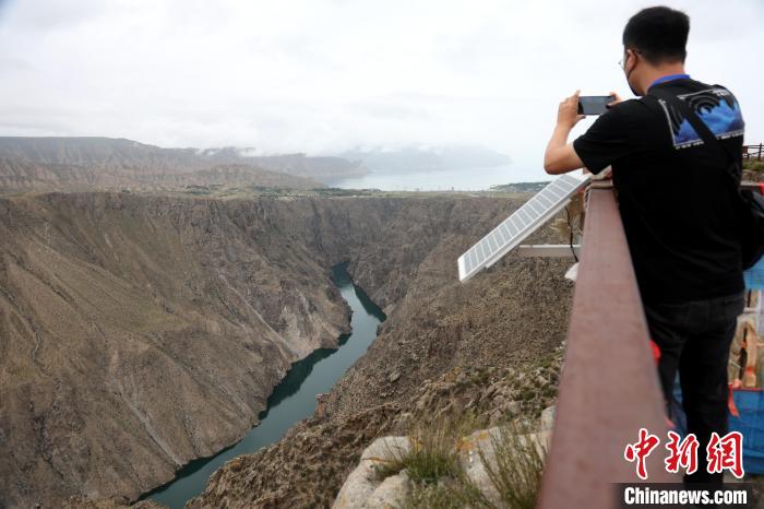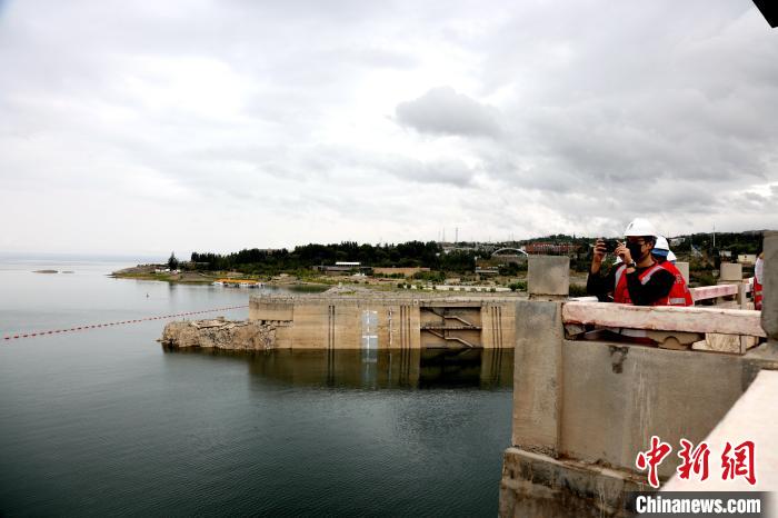 圖為網(wǎng)絡名人及媒體記者眺望龍羊峽水電站大壩。中新社記者 張?zhí)砀?攝