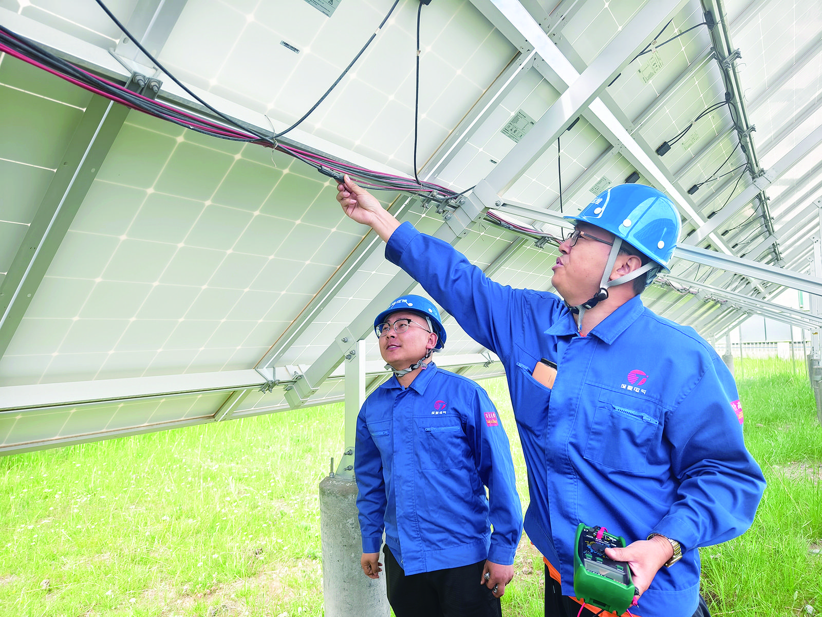 “通訊柜電壓電流正常;逆變器運(yùn)轉(zhuǎn)正常,無異響;線路正常,無破損,連接正常?!?/p>