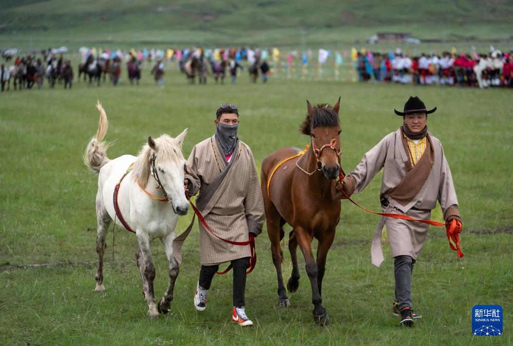 7月28日,當(dāng)?shù)厝罕娫趨⒓域T馬拾哈達(dá)比賽。新華社記者 江宏景 攝