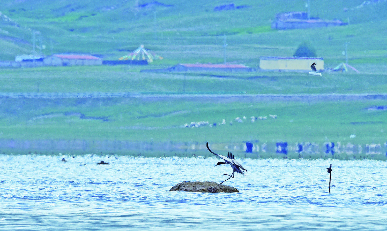黑頸鶴在管護員搭建的鳥窩中安家。