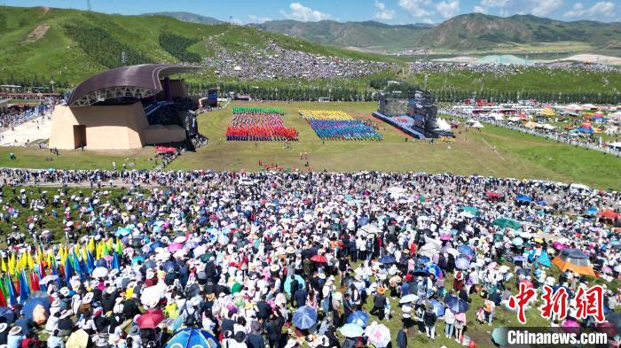 8月4日,第22屆九色甘南香巴拉旅游藝術(shù)節(jié)在甘肅省甘南藏族自治州當周草原開幕。人們身著節(jié)日盛裝載歌載舞、歡聚一堂,馬隊巡游、千人鍋莊舞等活動精彩上演。九色甘南香巴拉旅游藝術(shù)節(jié)既是民眾浪山聚會的節(jié)日盛會,也是展現(xiàn)發(fā)展成就、擴大對外開放的重要窗口,更是展示民俗文化、促進廣泛交往交流交融的有效載體。(無人機照片)中新社記者 九美旦增 攝