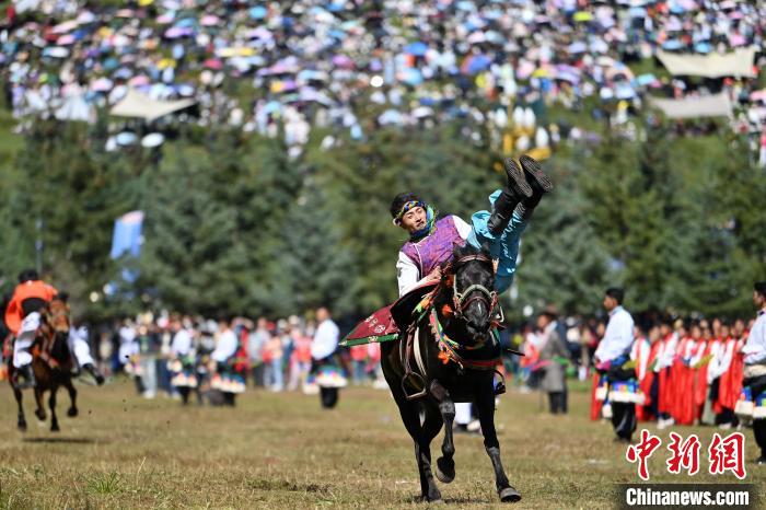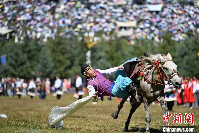 8月4日,藏族騎手在當周草原上表演馬術(shù)。中新社記者 九美旦增 攝