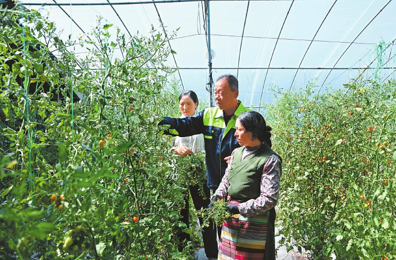 在瑪吉阿米花園農(nóng)莊的大棚內(nèi),山東壽光來(lái)的劉振國(guó)(中)在指導(dǎo)栽培技術(shù)。四川日?qǐng)?bào)全媒體記者 肖雨楊 攝