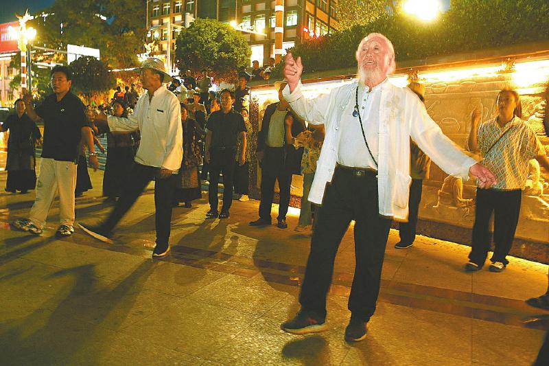 8月下旬,四川日報全媒體“向云端——尋路川藏線上的中國”采訪組來到巴塘縣城時,正是傍晚,縣政府旁邊的中山廣場上胡琴聲悠揚,當(dāng)?shù)厝罕妵μ鹆税吞联氂械南易游瑁恍┩獾赜慰鸵拆堄信d致地加入。