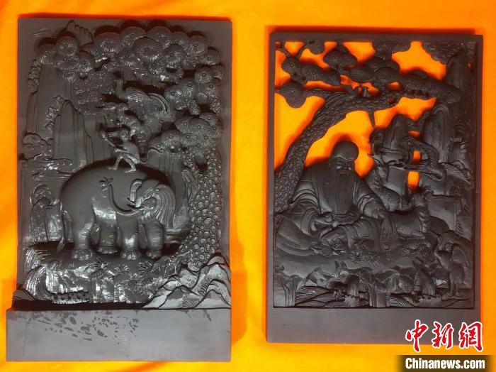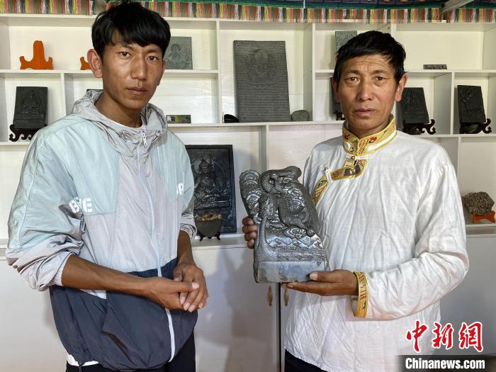 圖為多節(jié)才旦(左)與才旦加(右)展示澤庫和日寺石刻作品。受訪者供圖
