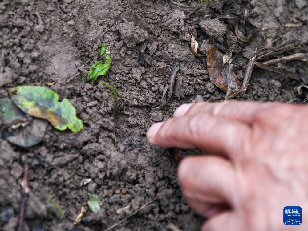 在四川白河國家級(jí)自然保護(hù)區(qū),唐玉林在巡護(hù)路上發(fā)現(xiàn)毛冠鹿的腳?。?0月11日攝)。新華社記者 王曦 攝