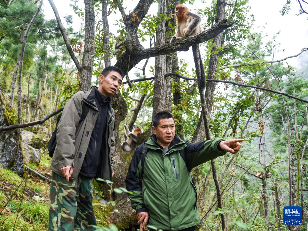 在四川白河國家級(jí)自然保護(hù)區(qū),唐玉林和川金絲猴互動(dòng)(10月11日攝)。新華社記者 王曦 攝