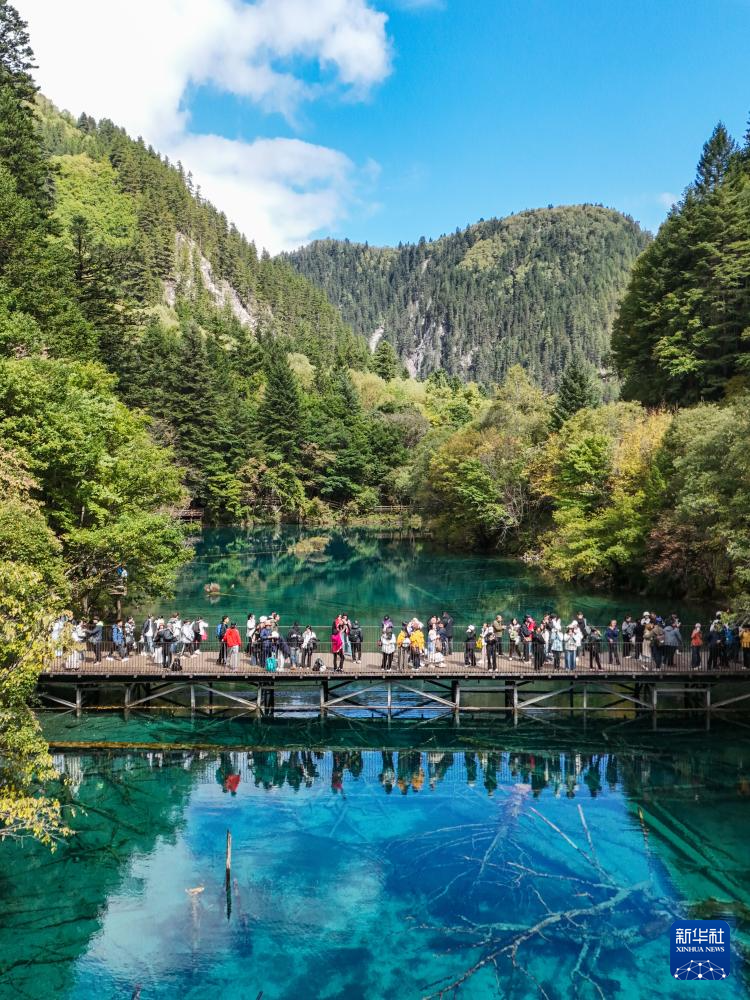 10月10日,游客在九寨溝景區(qū)五彩池觀光游覽。新華社記者 王曦 攝