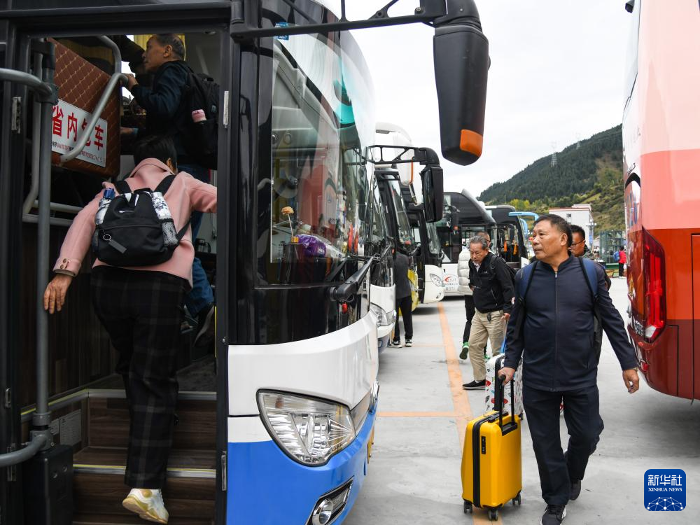 10月9日,游客在黃龍九寨站外乘坐通往景區(qū)的接駁車。新華社記者 王曦 攝