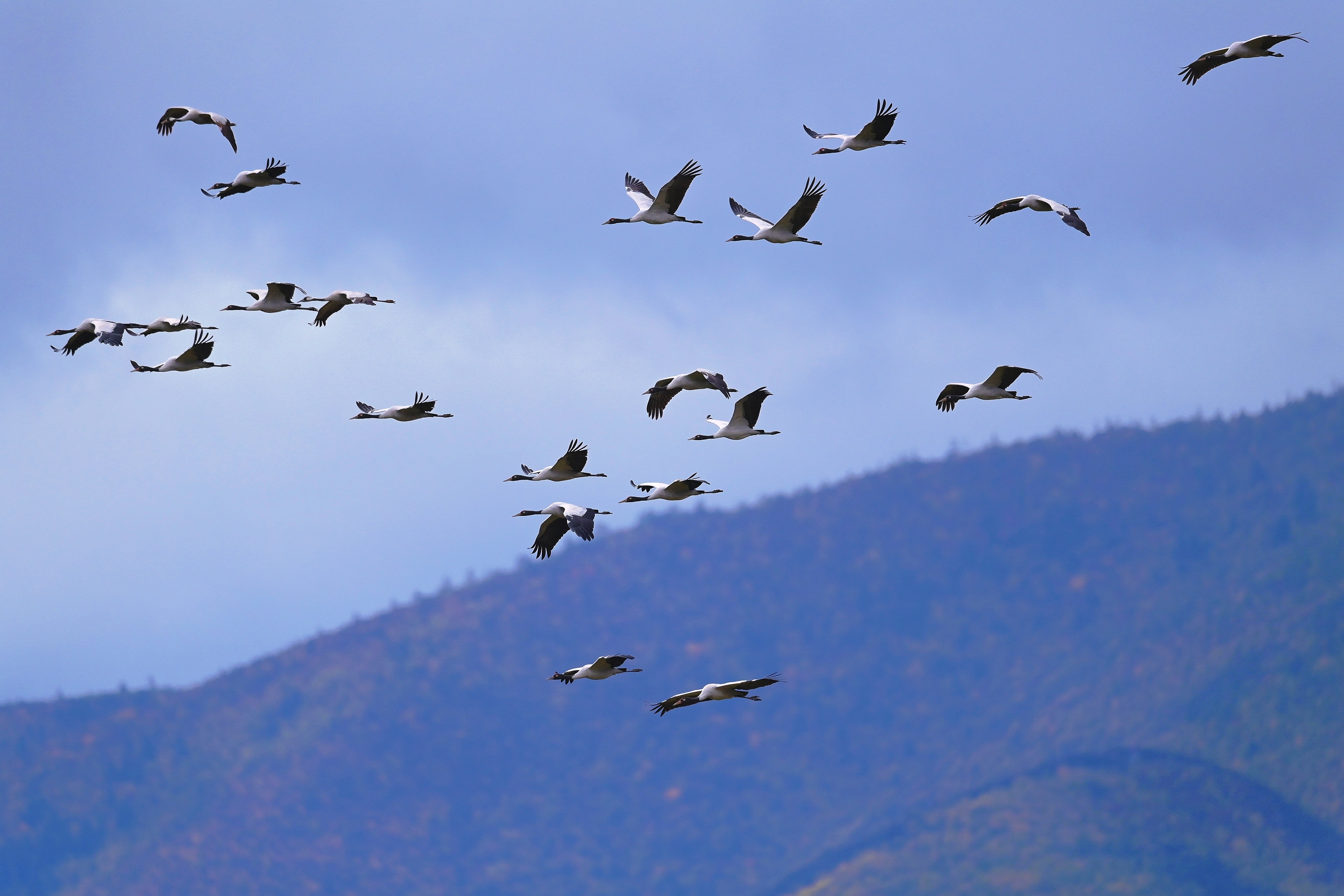 近日,香格里拉市納帕海省級自然保護(hù)區(qū)管護(hù)局工作人員監(jiān)測發(fā)現(xiàn),今年首批越冬黑頸鶴已飛抵納帕海。工作人員共監(jiān)測到黑頸鶴34只,其中幼鳥4只,與黑頸鶴同期飛抵的還有灰鶴2只,黑鸛61只。