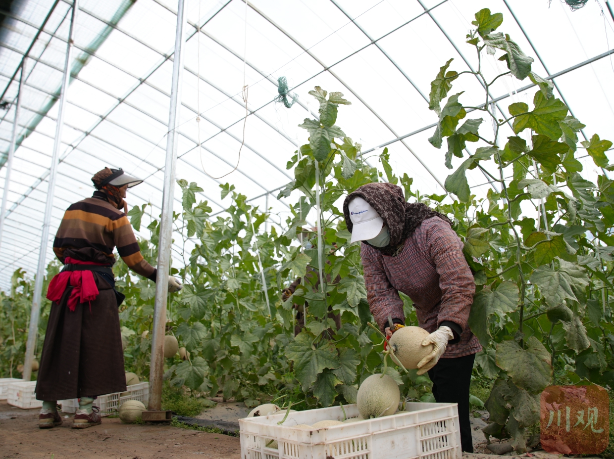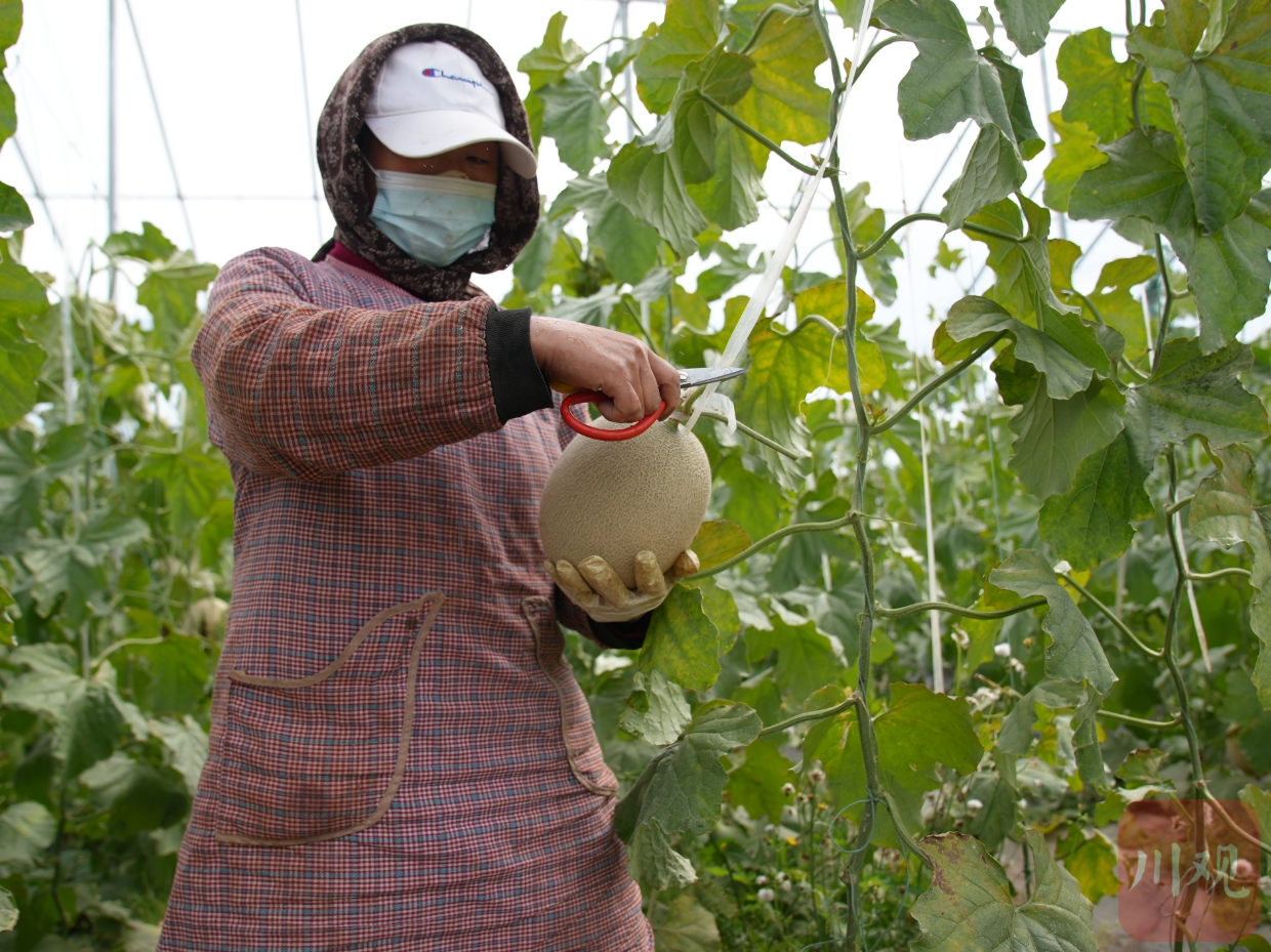 10月24日,松潘高原現(xiàn)代農(nóng)業(yè)產(chǎn)業(yè)園區(qū)內(nèi),果農(nóng)采摘網(wǎng)紋瓜。