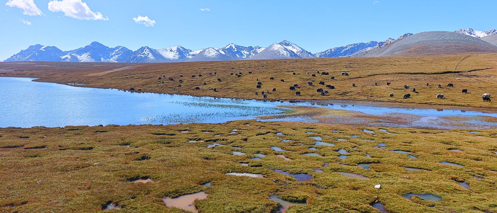 天遠地闊,我們在草原上行駛了數(shù)小時,眼前的風(fēng)景既相似又千變?nèi)f化。藍天和河流同樣鮮明澄澈,初秋的短草已經(jīng)開始泛黃,時不時能看到野生動物出沒,藏野驢、藏羚羊、黑頸鶴……