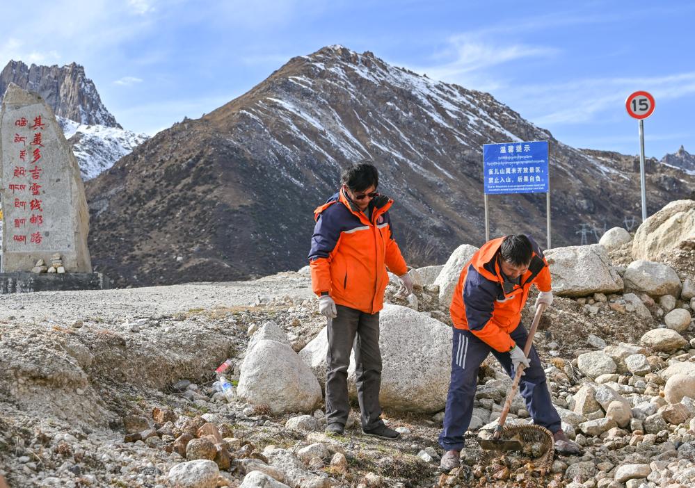 11月1日,黎平(右)和同事在國道317雀兒山段清理路邊的溝渠。新華社記者 王曦 攝