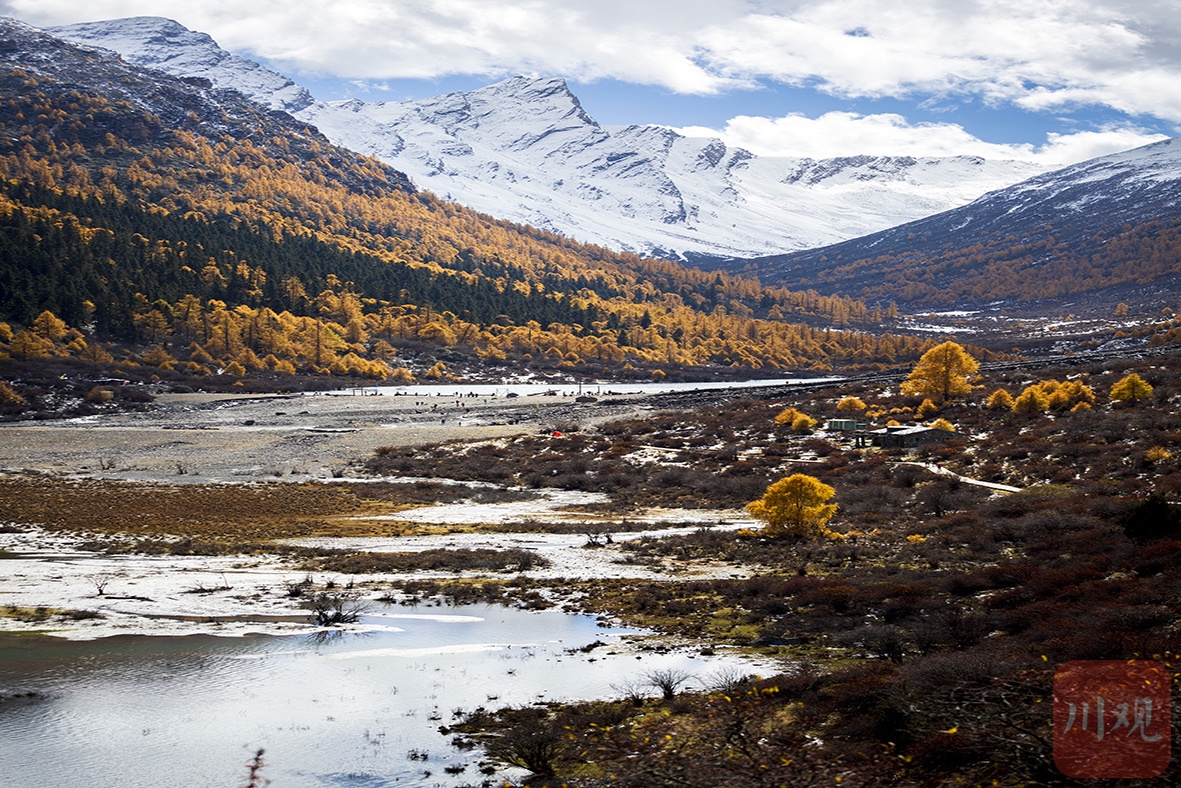 瑪嘉溝里,初冬仍有金秋余韻,金黃與火紅交織成樹木的盛裝。溪流潺潺,倒映著山色,樹葉如雪花飄落,鋪在小徑上,腳步踏上去沙沙作響,山陰處有初雪;行徑在夢筆山理小路,沿小路前行別具風情,仿佛能穿越時空。初雪覆蓋的山巒在陽光下閃耀金光,與青稞田構(gòu)成一幅絕美的田園風光。