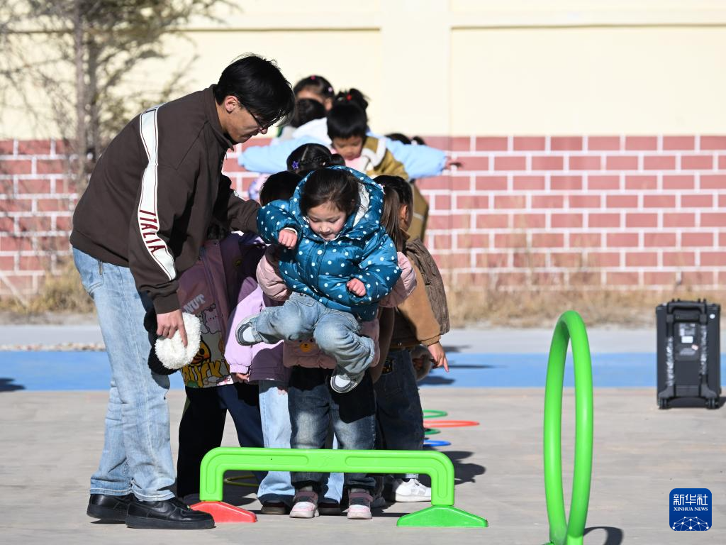 11月14日,在天峻縣民族幼兒園,小朋友們在老師帶領下上體育課。新華社記者 張龍 攝