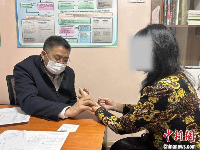 圖為青海省藏醫(yī)藥專家斗周才讓(左)在蒙古國問診交流。受訪者 供圖