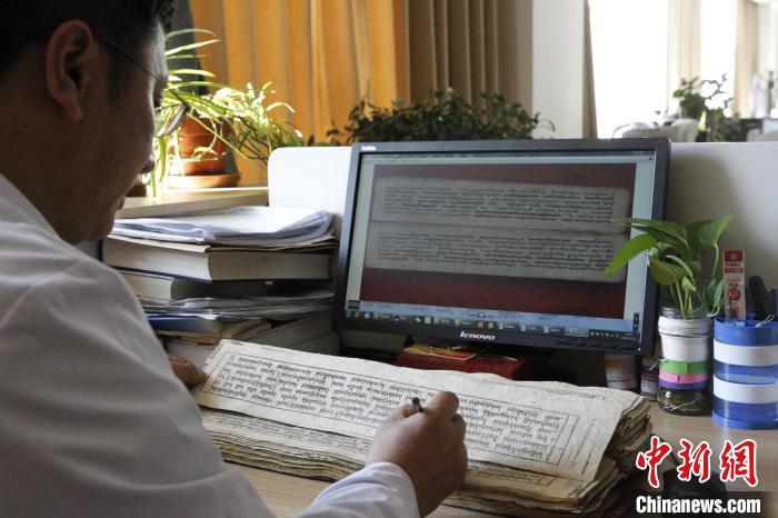資料圖為研究人員整理藏醫(yī)藥古籍文獻(xiàn)。張?zhí)砀?攝