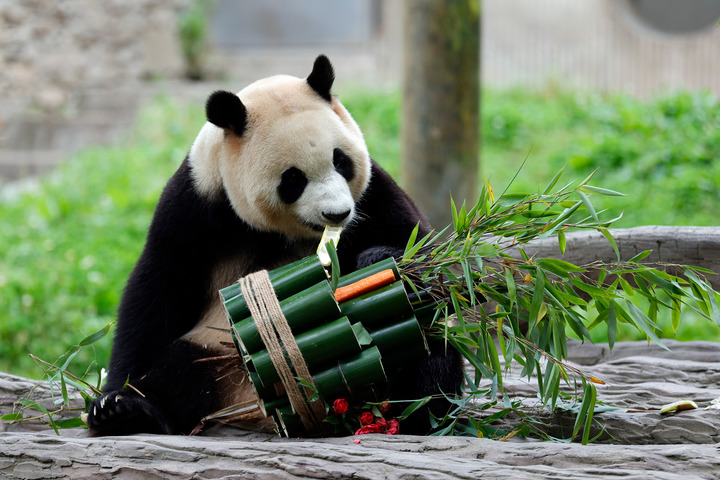 6月12日,大熊貓“福寶”在中國大熊貓保護研究中心臥龍神樹坪基地的圈舍進食。新華社記者 沈伯韓 攝