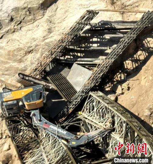 事故現(xiàn)場(chǎng)單雙層貝雷梁坍塌后扭曲變形。阿壩州應(yīng)急管理局供圖