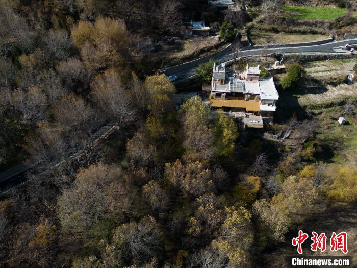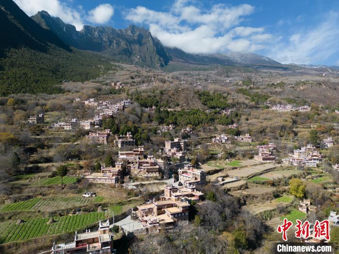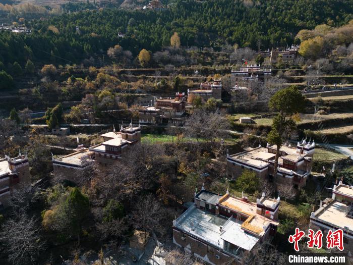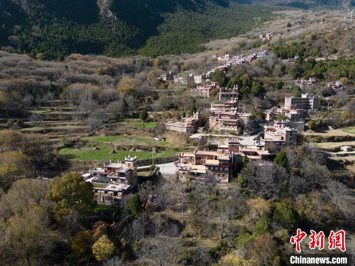 12月3日,四川省甘孜州丹巴縣,俯瞰甲居藏寨全貌。初冬時節(jié),甲居藏寨一幢幢藏式樓房在藍天白云映襯下,呈現(xiàn)出一幅色彩斑斕的景象。(無人機照片)中新社記者 張浪 攝